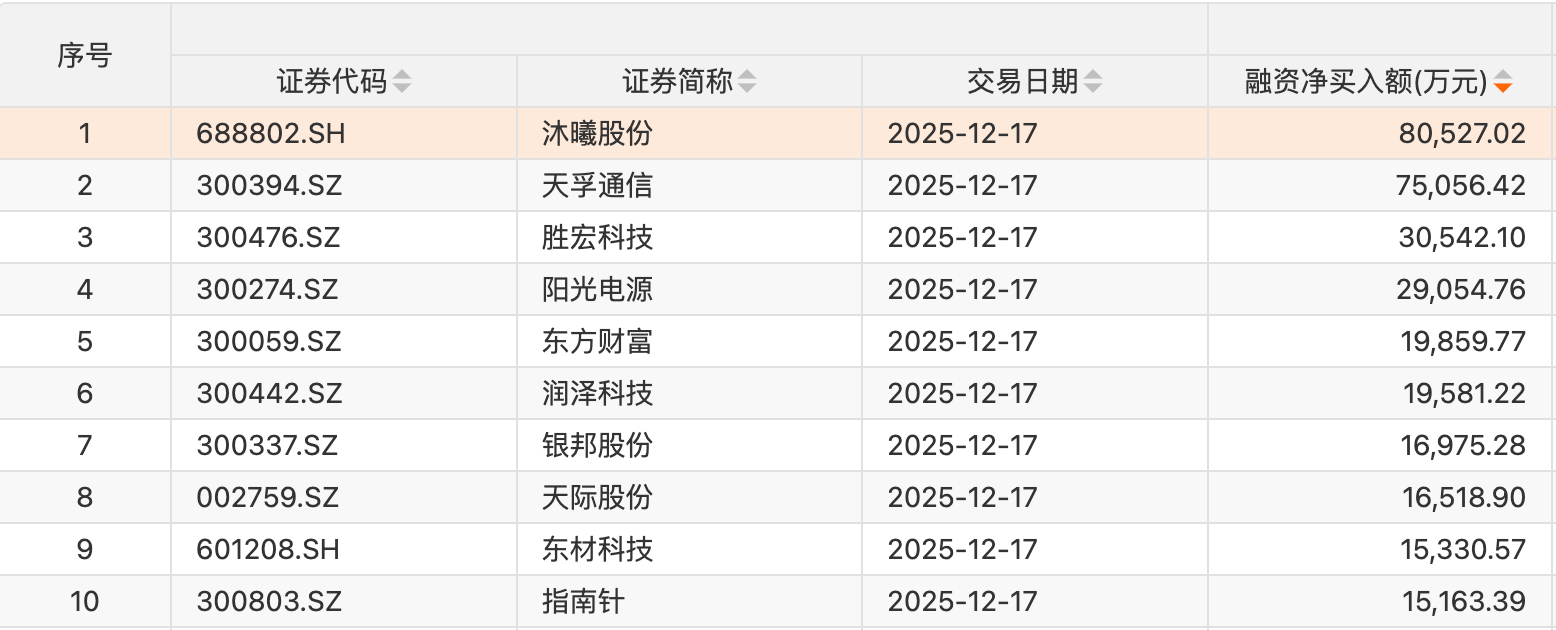 個(gè)股方面,21只個(gè)股獲融資凈買入額超1億元。沐曦股份獲融資凈買入額居首,凈買入8.05億元;融資凈買入金額居前的還有天孚通信(300394)、勝宏科技(300476)、陽光電源(300274)、東方財(cái)富(300059)、潤(rùn)澤科技(300442)、銀邦股份(300337)、天際股份(002759)、東材科技(601208)、指南針(300803)等。