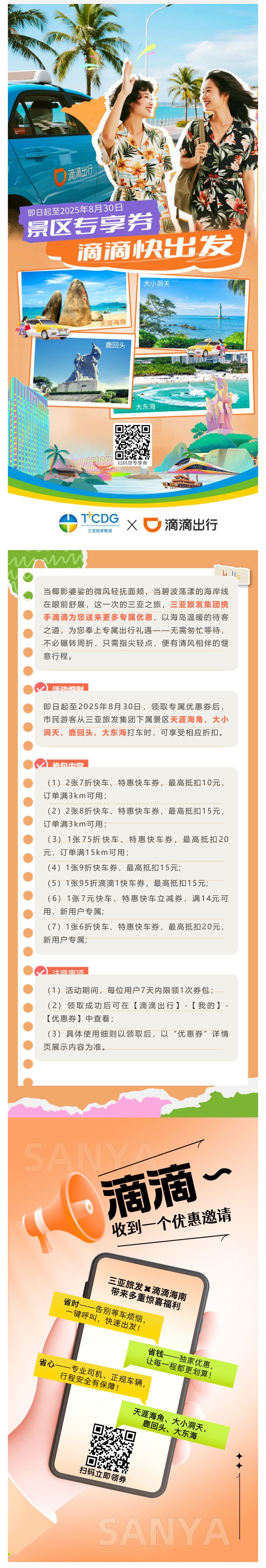 景區(qū)專享券,滴滴快出發(fā)!三亞旅發(fā)集團(tuán)攜手滴滴海南獻(xiàn)上聯(lián)名優(yōu)惠