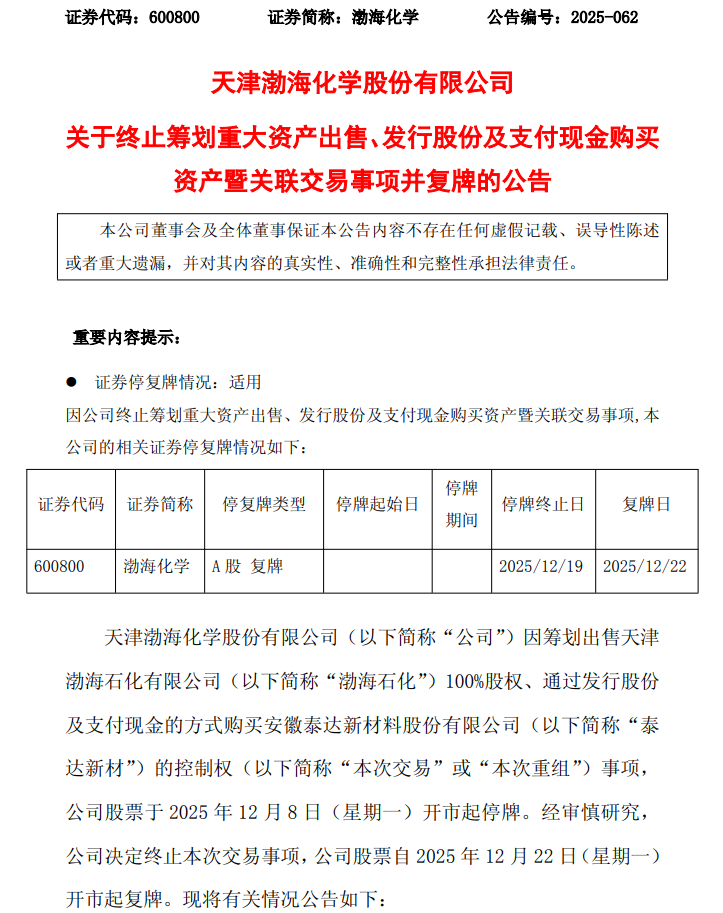 停牌兩周后,12月19日晚間,渤;瘜W(600800)披露公告稱,公司終止籌劃重大資產(chǎn)出售、發(fā)行股份及支付現(xiàn)金購買資產(chǎn)暨關聯(lián)交易事項,公司股票自12月22日起復牌。