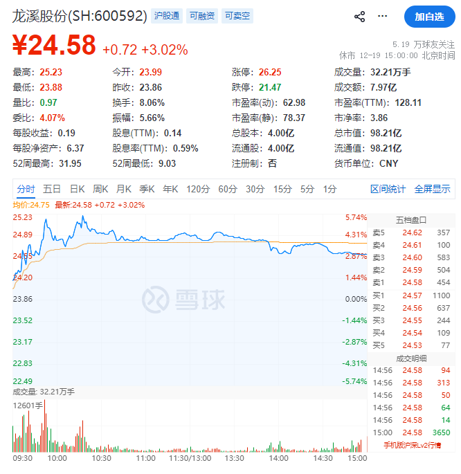 二級(jí)市場(chǎng)上,截至12月19日收盤,龍溪股份漲3.02%,報(bào)24.58元/股,總市值98.21億元。
