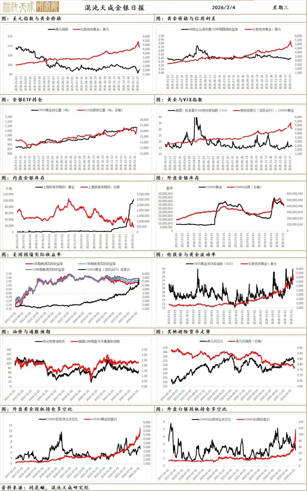 從ETF持倉起來看,全球最大黃金ETF(518680)--SPDR Gold Trust持倉較上日減少3.72噸,當(dāng)前持倉量為1083.38噸;全球最大白銀ETF--iShares Silver Trust持倉較上日減少108.89噸,當(dāng)前持倉量為16437.7噸;繼周一白銀ETF的大幅拉漲后,周二持倉整體相對(duì)穩(wěn)定,只是對(duì)于高杠桿投機(jī)需求的打壓。但從Comex和上期所的持倉來看相對(duì)有所下降,這也側(cè)面印證投機(jī)需求被打壓的情況。
